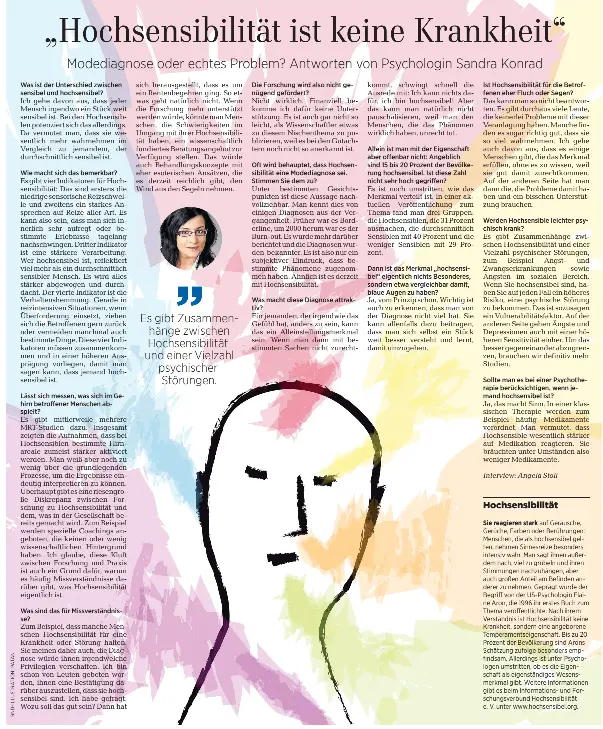 Die Vorteile leben Sandra Konrad rät Ärztinnen und Ärzten denn auch das Thema anzusprechen wenn bei Patienten das Lei-den an einer möglichen Hochsensibilität im Vorder-grund steht und bei Bedarf etwa psychologische Fachhilfe vorzuschlagen. Mit seiner Veröffentlichung läge erstmals eine umfangreiche wissenschaftliche Monografie vor die das Potenzial hätte Anknüpfungspunkte für eine fachwissenschaftliche Diskussion zu liefern. Dandra Konrad ist Diplom-Psychologin und Expertin für Hochsensibilität.